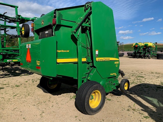 2008 John Deer 468 Silage Special round baler. 4x6' bale. Mega-Wide pick up. 540 PTO. 31X13.5, 8ply hi-float tires. Bale push bar. Twine and net wrap. Hydraulic lift pick up. 1 owner. Local trade in.