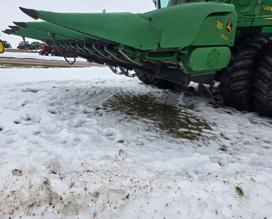 2011 606C STALKMASTER 6-row corn header in excellent condition. Features StalkMaster chopping, opposed knife rolls, and header height sensors. Includes stalk stompers for tire protection. Field-ready and well-maintained. Call