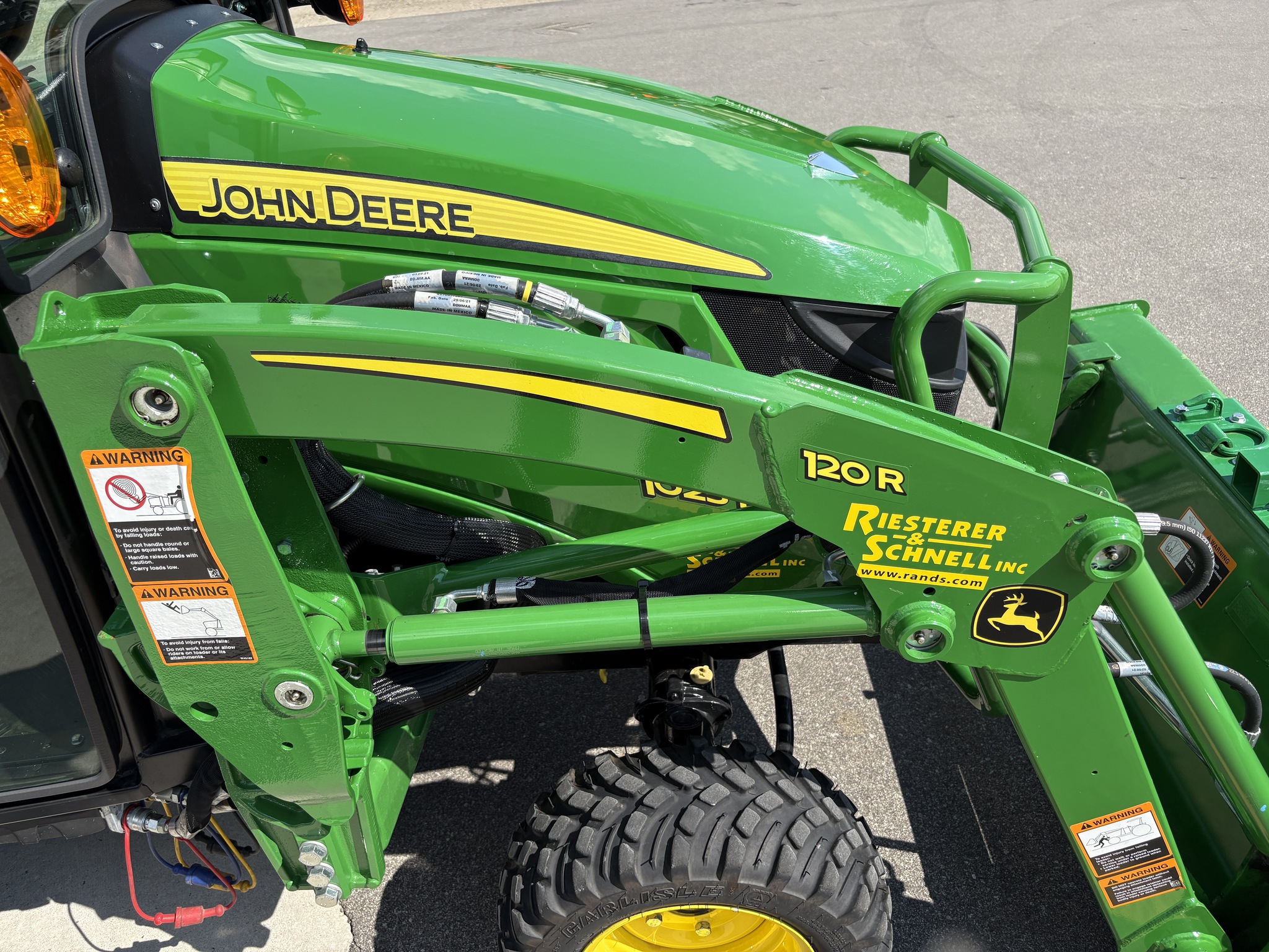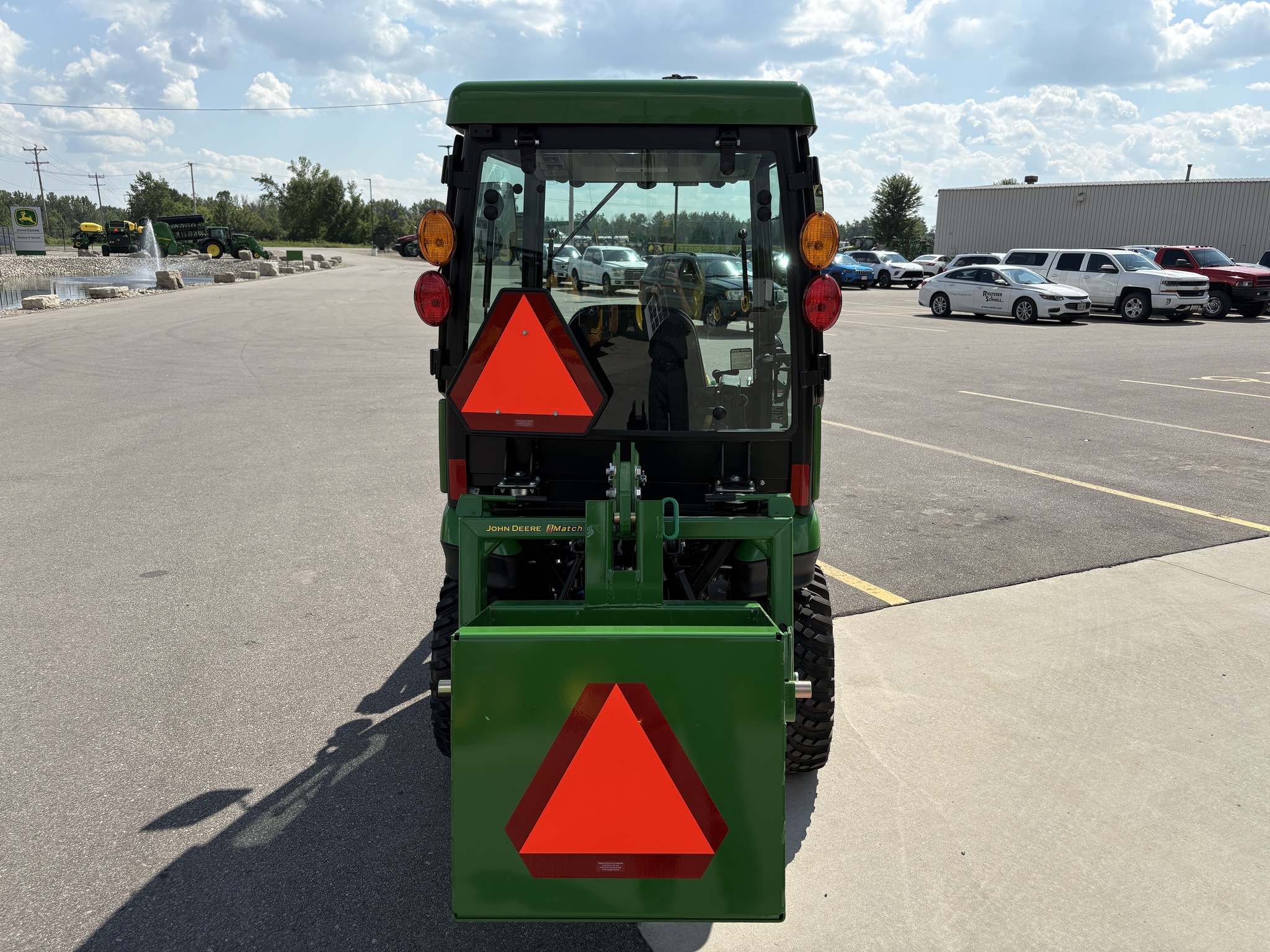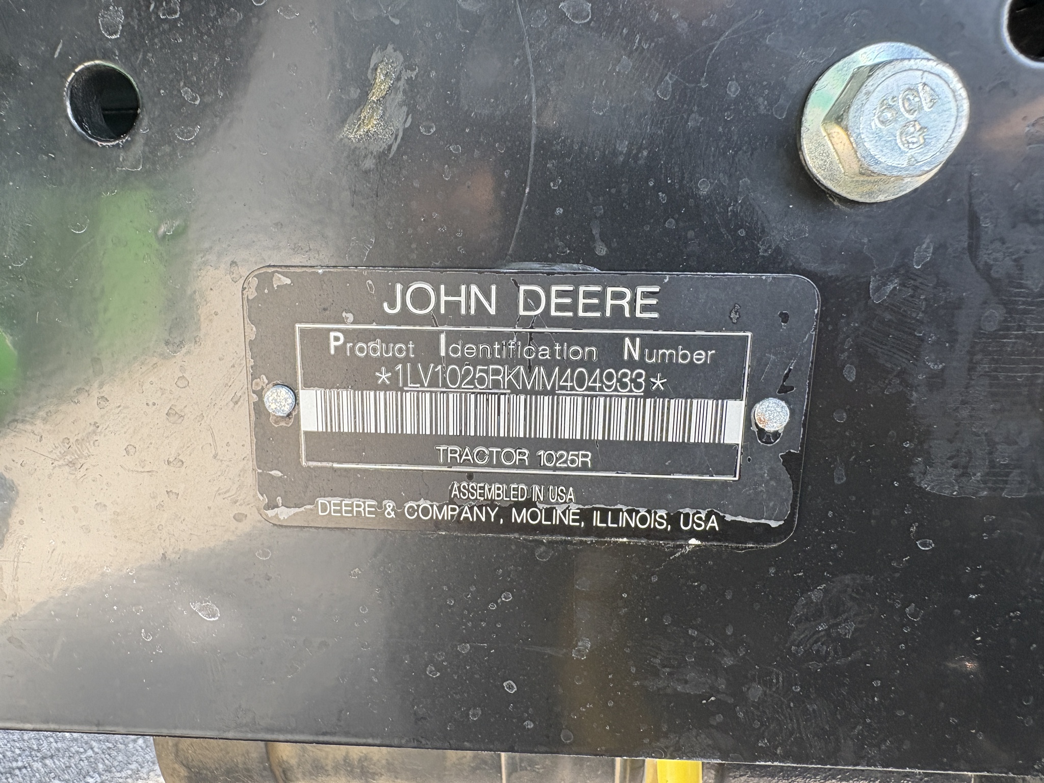 2021 John Deere 1025R Compact utility tractor with Cab, Heater, defroster, 120R loader with bucket, hooks and receiver up front, hood guard, ballast box and quick hitch. Like new condition with super low hours.