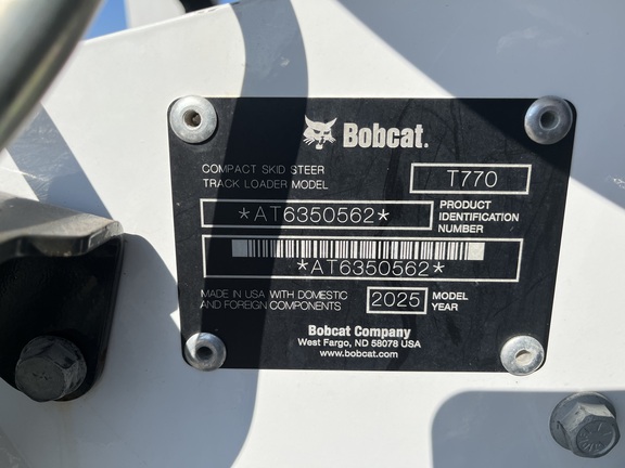 2025 Bobcat T770 Compact Track Loader. Cab with HVAC, QuickTach, Ride Control, 2 Speed, 17" Tracks, Radio, Rear Cameras, Switchable Controls, 3 sets of counterweights, 84" construction bucket. Has a Full Comp warranty till June of 2030. Loaded up machine!!