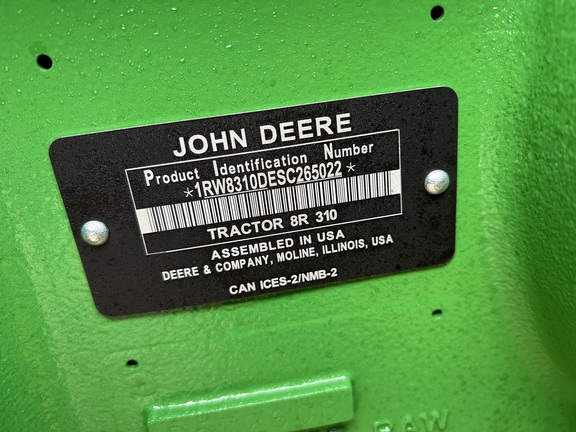 2025 John Deere 8R 310, IVT, 31 MPH with Command Pro Control, Front suspension, front fenders, rear fender extensions, Active Command Steering, Autonomy ready and rear implement Ethernet, Integrated Starfire SF1 Receiver, Cab Suspension, Ultimate Cab and Ultimate Visibility package, 12 Front weights, 1800 Lbs of rear wheel weights, 710/42 rear duals and 600 fornts, 20,000Lb rear hitch. Factory warranty till October of 2027 with ext. warranty till October of 2030. Call today on this very clean one owner tractor before its gone.