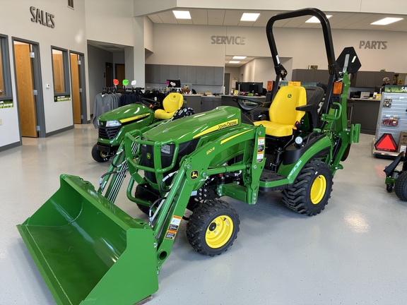 2026 John Deere 1025R SubCompact Utility Tractor, Open Operator's Station, Factory installed Loader with Single Point Hydraulic Coupler and Bucket, BH160 Backhoe, Less iMatch Quick Hitch Category 1, R4 Tires. *Offers valid until 4/30/26 or while supplies last. Cash Price listed. Financing is available subject to approved credit. Tax and down payment may be required at purchase. Some restrictions may apply. Images may not represent actual tractor. Location restrictions apply. See dealer for more information.