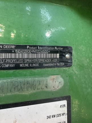 2022 John Deere 412R 120' boom 20" spacing with ExactApply, pressure recirc and product reclaim, Powertrain wrty till June 2027. Float tires and new row crop tires, Front fill, stainless steel Eductor, Integrated receiver, RowSense and Vision camera. Very clean one owner machine. Call today before this unit is gone.